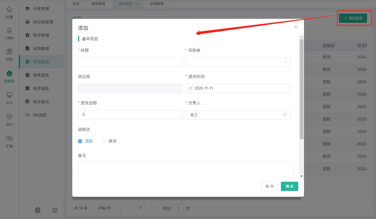 新增退货单需要选择对应的采购单,产品模块需填写退货数量,退货金额可根据退货数量、单价自动生成,如果不按照原价进行退货可填写协商之后的价格。