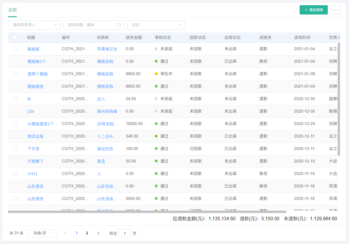 可直接在筛选框中输入退货单标题、编号、负责人和审核状态进行采购退货单的搜索,列表页展示可查看当前退货单的审核状态、回款状态、出库状态。列表右下角是相关统计数据:应退款金额、已退款金额、未退款金额。
