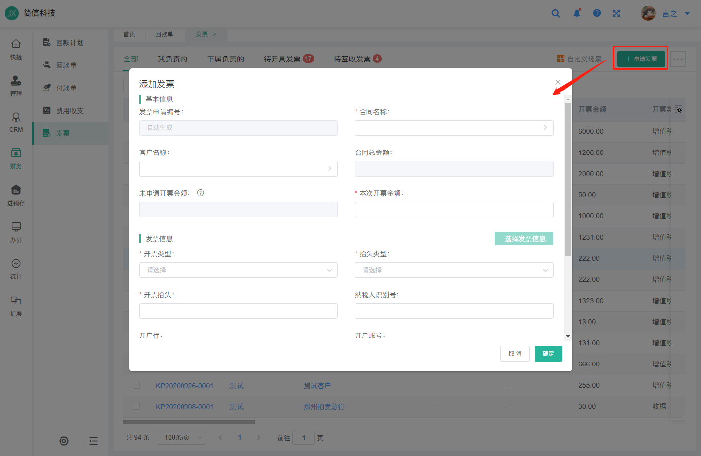 发票审核成功后,财务人员可点击右上角的“开具发票”,并填写相关信息。